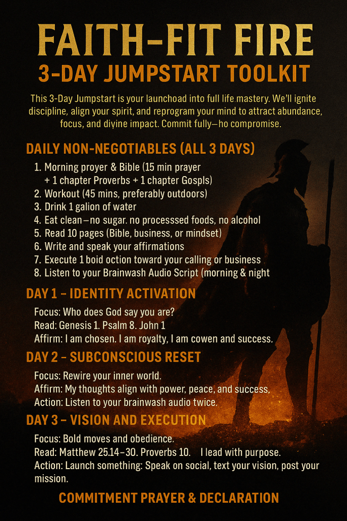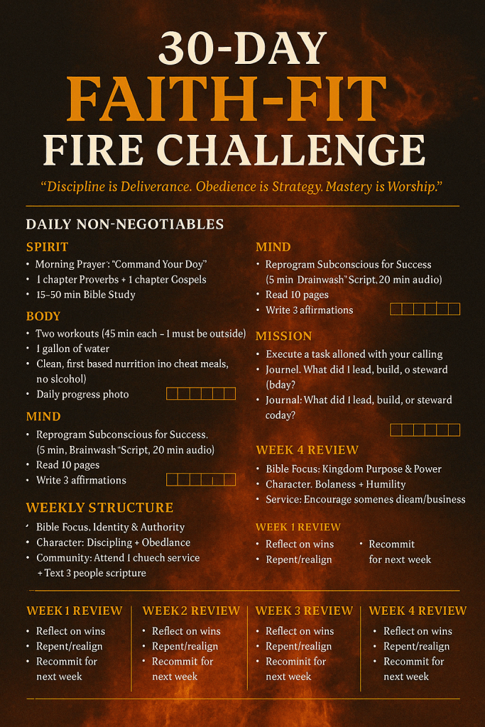 In just 30 days, you’ll experience more than just a change in your physical body—you’ll gain clarity, purpose, and the burning desire to live a life that is on fire for your calling. Whether you’re looking to break through barriers, lose weight, or strengthen your body for the journey ahead, the Faith Fit Fire Challenge is designed to help you rise above any obstacle. It’s time to make your faith, fitness, and finances work in harmony to create a future that is fit for a champion. Let’s get started—ignite your fire today!